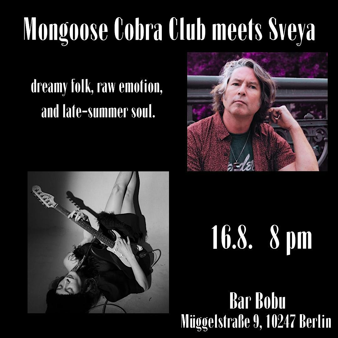 Bar Bobu | Berlin | Friedrichshain | Bar | Restaurant | Club | Live Music Müggelstraße 9, Berlin, BE, GermanyFor fans of Nick Drake, Adrienne Lenker and Bright Eyes Mongoose Cobra Clubs music captures the restless ache of belonging.BAR BOBU proudly presents live on stageMONGOOSE COBRA CLUBandSVEYAdoors: 19hdonation basedKevin […]